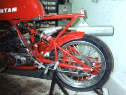 Andy's much modified 125 Bantam. Note the reed valve setup and LH gearchange. |